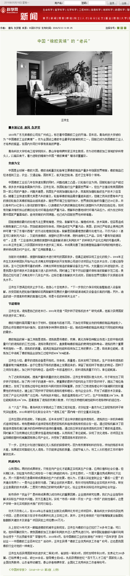 4月21日,应《中国科学报》的邀请,机电学院院长汪传生教授接受了该报记者的专访。