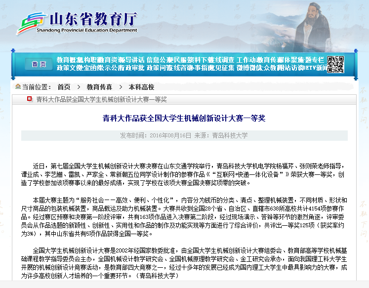 近日,第七届全国大学生机械创新设计大赛决赛在山东交通学院举行,我校best365体育官网平台杨福芹、张泽荣老师指导,谭业成、李艺姗、雷凯、严家全、常新朝五位同学设计制作的参赛作品《“互联网+快…