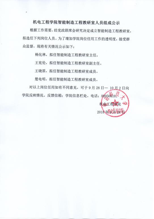 best365体育官网平台智能制造工程教研室人员组成公示