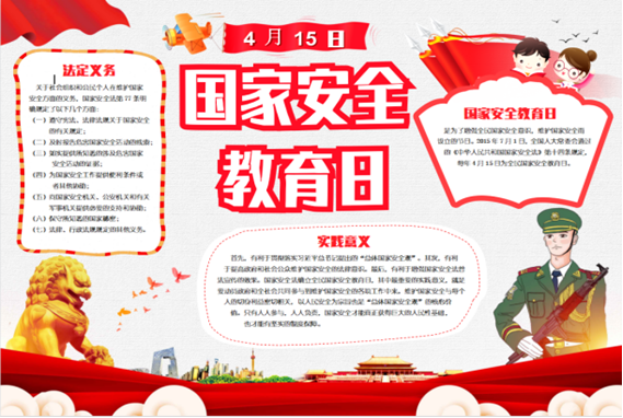 2022年4月15日是第七个全民国家安全教育日。为进一步普及国家安全知识,教育引导学生认清当前严峻复杂的国家安全形势,增强国家安全意识,为党的二十大胜利召开营造良好氛围,机电工程工程学院紧紧围绕"国家安全,人人有为"的主题开展“国家安全日”系列教育活动,提高学生安全意识,营造校园安全氛围,提高防范和抵御风险的能力。