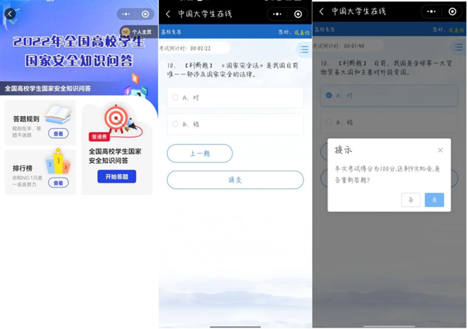 best365体育官网平台组织同学们参与“全国高校学生国家安全知识问答活动”,全面普及学生安全意识,强化安全教育,大力营造校园安全文化氛围。知识题目涉及国家安全、网络安全、疫情防控、宿舍安全和食品安全等方面,2000余人积极参与知识竞答。此次答题活动具有很强的现实意义,在一定程度上进一步提升学生安全知识储备,提高了同学们学习安全知识的主动性与积极性。要切实增强学生的总体国家安全观和责任感,把校园安全工作抓早抓小、抓实抓细,营造时时讲安全,事事讲安全,人人讲安全,人人抓安全,保证人人安全的良好校园氛围。