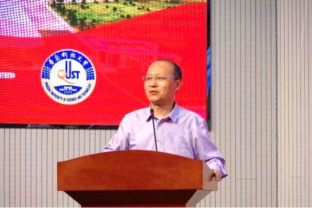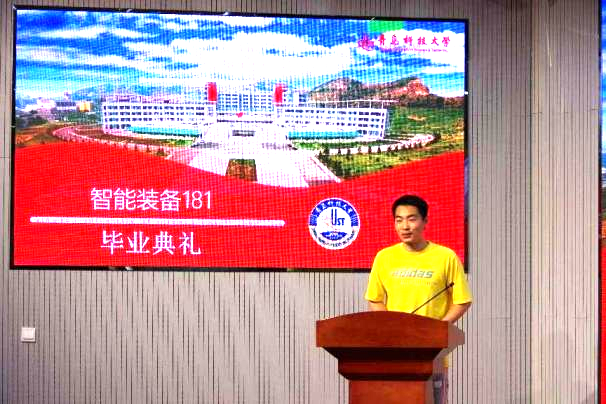 接下来,班主任杨化林老师上台致辞。四年来,杨院长陪同智能装备181班学生不断成长,对于智能装备181班取得的成绩表示赞扬。杨院长首先恭喜大家,智能装备181班同学由于勤奋学习,刻苦钻研,取得了全班考研率33%的优异成绩,超过学院平均水平。杨院长指出,智能装备181班作为机电学院首届智能制造工程毕业生,各方面表现突出,作出了积极表率。与此同时,杨院长祝福毕业生——心期梦归处,不负韶华年;于道各努力,千里自同风。