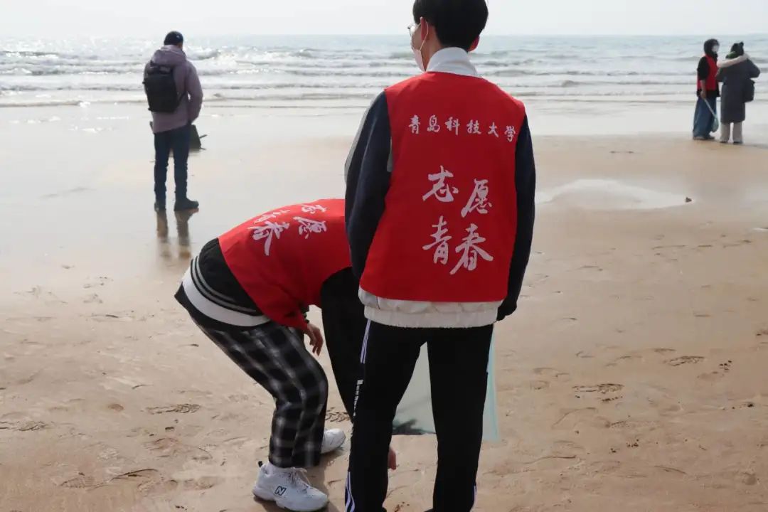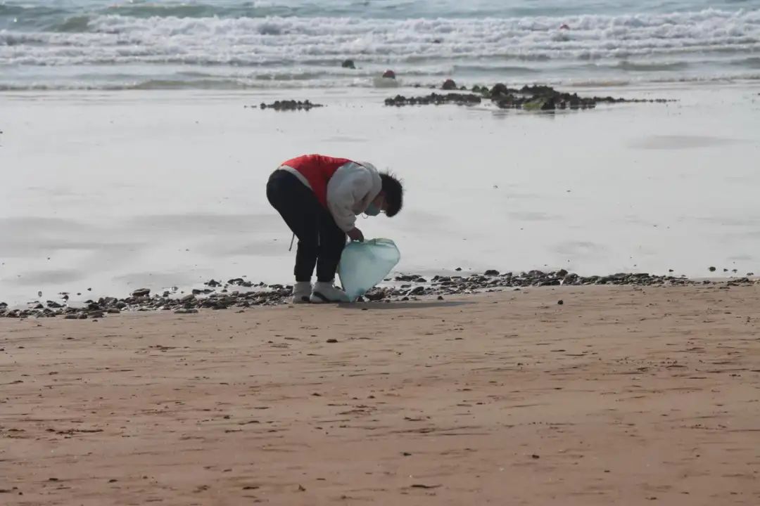 志愿者们佩带团徽、身穿红马甲、手提垃圾袋,逐段排查,分工协作,并对塑料袋、漂流废弃物和废弃生活垃圾等进行分类收集。初春的寒风也没能将志愿者们的热情冲淡,他们用自己的方式,将爱汇聚在海岸线,为共同建设“美丽青岛”的目标贡献青春力量。