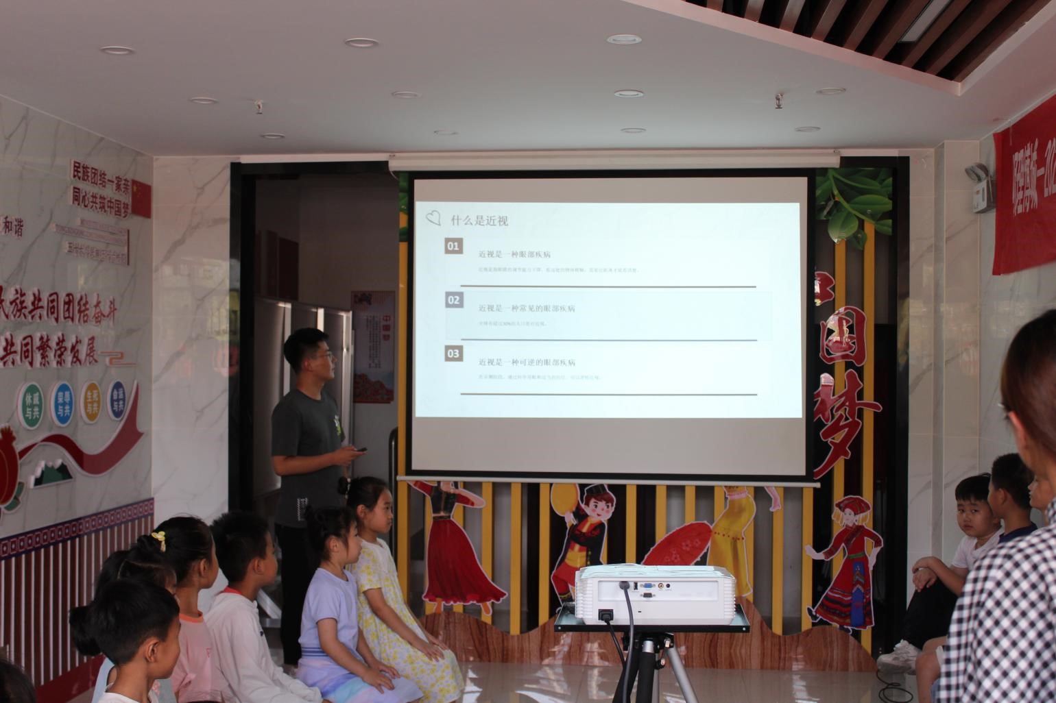 调研团成员张文佳为孩子们带来“用眼健康科普”专题课堂。她重点讲解了常见的眼部问题和预防方法。她向学生们介绍了近视、眼疲劳、干眼症等常见问题,并提供了预防和缓解这些问题的方法。她使用实际案例和图片来说明这些方法的实施步骤,并强调了正确用眼和保护眼睛的重要性。她还组织了一些实践活动,让学生们进行眼保健操和眼部按摩的练习。通过这些活动,学生们可以亲身体验到眼部按摩的舒适感,并学会一些简单的眼保健操动作。这样一方面可以缓解眼部疲劳,另一方面也能让学生们更加深入地理解眼保健的重要性。
