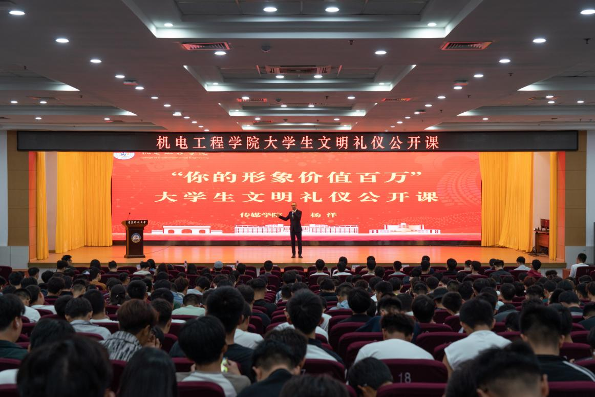 传媒学院杨洋老师讲授大学生文明礼仪公开课。现场邀请学生上台互动,营造学礼、明礼、尊礼、用礼的浓厚氛围,与会同学纷纷表示在校园日常生活中要将言语化为行动,倡树文明新风,争做时代新人,不断展现机电学子良好风采。