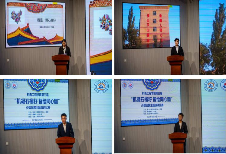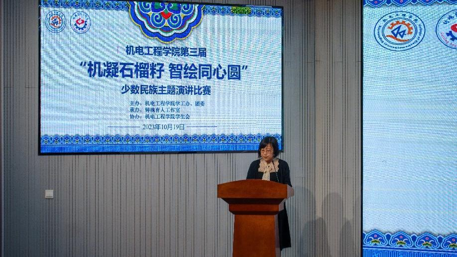 为深入开展学习贯彻习近平新时代中国特色社会主义思想主题教育,进一步加强爱党爱国教育、民族团结进步教育,引导我院各民族青年学生铸牢中华民族共同体意识,10月19日,机电学院第三届“机凝石榴籽 智绘同心圆”少数民族主题演讲比赛在机电学院530报告厅举行。学院学工办主任王娟娟、少数民族专职辅导员热孜亚·茹孜、新生辅导员、青马学员参加此次活动。