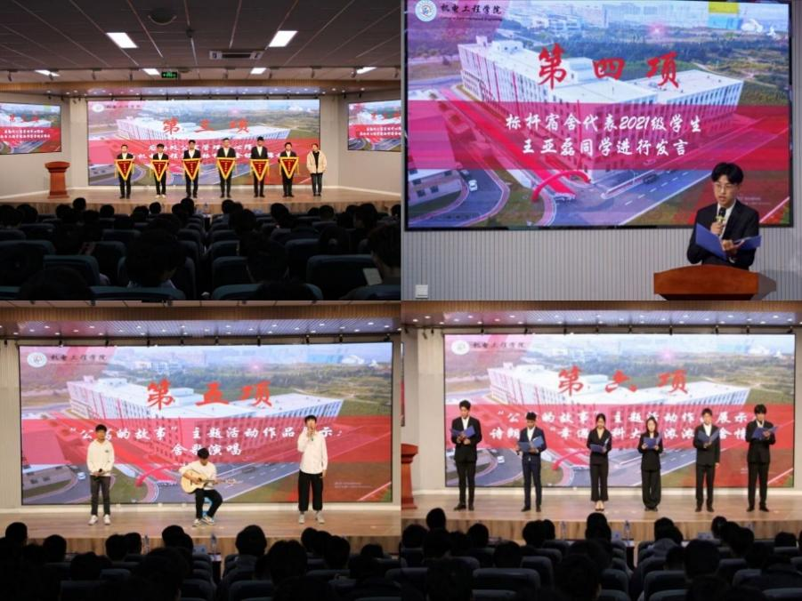 best365体育官网平台党委副书记兼副院长肖强宣读《best365体育官网平台宿舍文化节实施方案》。后勤处公寓管理中心隋玲老师为学院标杆宿舍颁发锦旗。best365体育官网平台2021级优秀宿舍学生代表王亚磊发言,进行“公寓的故事”优秀作品舍歌演唱以及诗朗诵“幸遇青科大,浓浓宿舍情”。