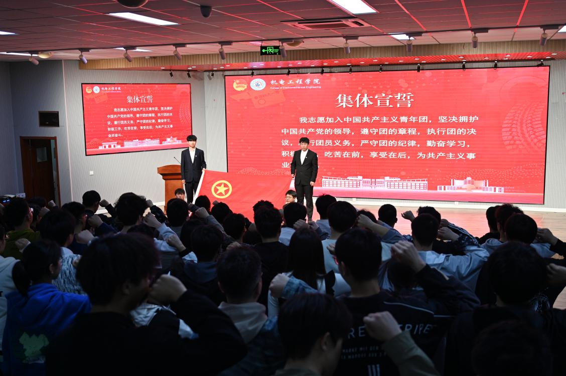 仪式第二阶段,学院新任团委书记逄柏鹏召开专题团课并领学《中国共产主义青年团普通高等学校基层组织工作条例》,重点组织学习了高校基层团组织的指导思想、工作原则、组织设置、工作职责和队伍建设等内容。