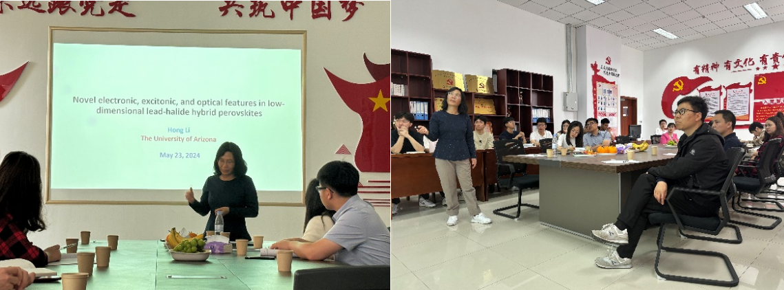 5月23日,美国亚利桑那大学化学与生物学院Li Hong教授受邀莅临best365体育官网平台,开展题为“低维铅-卤化物杂化过氧化物中的新型电子、激子和光学特征”的学术报告。山东大学的李元老师、吉林大学的王同辉老师,青科机电新能源科学与工程系的刘治明、王晓君、白文娟、楚电明、李建伟、王雨霄和李慧芳等老师,以及能源动力工程专业的部分研究生到场听取了本次报告。