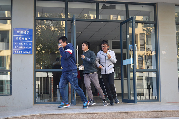 前期准备,指挥长向同学们讲述了消防安全应急知识,教同学们在火灾发生时如何正确的扑救、自救和快速逃生。随后,演练正式开始,工作人员点燃事先准备好的模拟烟雾弹,北苑2号楼的一楼及二楼随即浓烟滚滚,宿舍楼内安全警报系统在第一时间启动,各宿舍内学生迅速反应,用毛巾衣服捂住口鼻,低头弯腰躲避浓烟,按照指引沿安全通道撤离“火灾现场”,及时疏离到户外安全位置。最后,指挥长对此演练做出简要总结,希望同学们能增强消防意识。至此,消防安全逃生演练顺利结束。