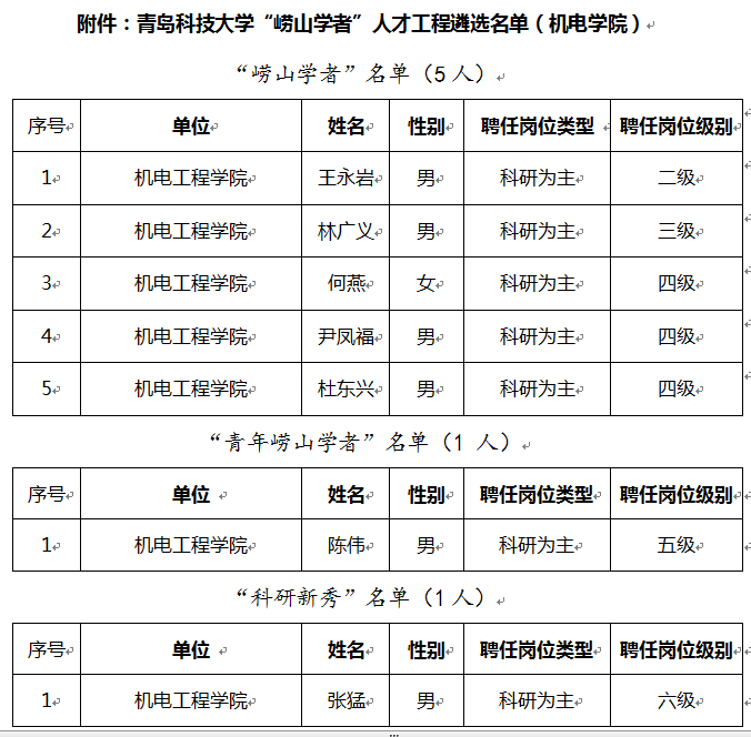 近日,学校公布best365体育官网平台“崂山学者”人才工程遴选公示名单,机电学院7名老师榜上有名,王永岩、林广义、何燕、尹凤福、杜东兴5名老师获“崂山学者”荣誉称号;陈伟老师获“青年崂山学者”荣誉称号;张猛老师获“科研新秀”荣誉称号。