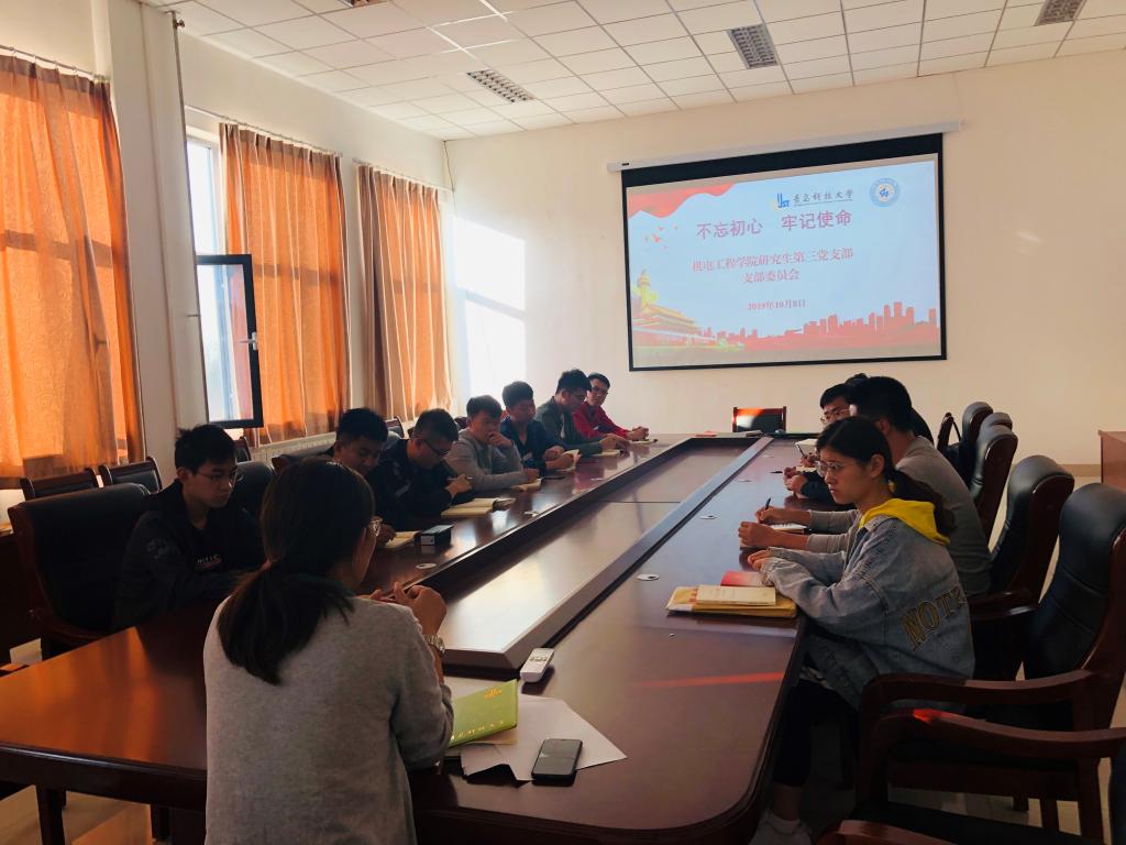 为认真贯彻落实学校“不忘初心、牢记使命”主题教育工作安排,激发研究生新生党员树立正确的人生观、价值观,强化自身的责任意识和使命担当精神,营造爱国爱校氛围、凝聚奋进力量,10月8日下午,best365体育官网平台研究生第三党支部在机电楼518会议室召开 “不忘初心再出发,牢记使命勇担当”主题教育会议,机电学院党总支副书记兼副院长王伟参加并主持了会议。