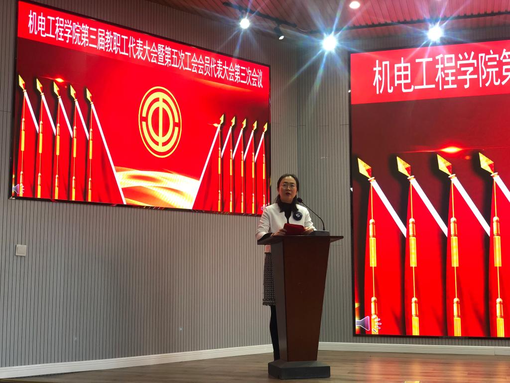 何燕向大会作了《解放思想 攻坚克难 不忘初心使命 潜心立德树人 全面推动学院各项事业行稳致远向前进》的工作报告。指出第三届教代会暨第五次工代会第二次会议以来,学院各方面工作取得了丰硕的成绩,学院党建、学生教育管理、教学管理等各项考核位居学校前列,学科建设取得重大发展,科研成果成就创历史性突破。机电学院将始终高举创新发展的旗帜,在校党委、校行政的坚强领导下,以党建推动中心工作为宗旨,以智能制造统揽全局,凝心聚力,推动各项事业跨上新征程、迈上新台阶!