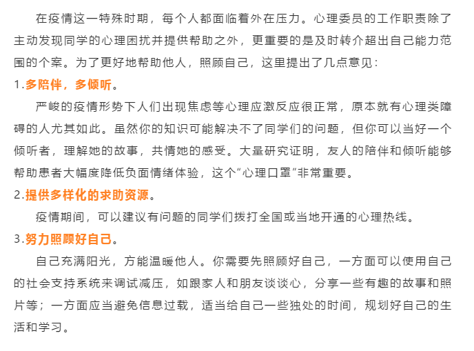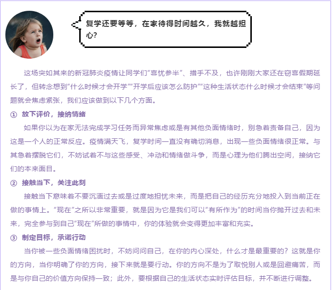 第一期的主题是“心理知识篇”。主要是针对在家隔离期间出现焦虑心理的学生。活动提出了相应的举措来应对这些心理问题,目的是让此类问题的同学放下焦虑,安心在家学习,与我们的国家一起共渡疫情。