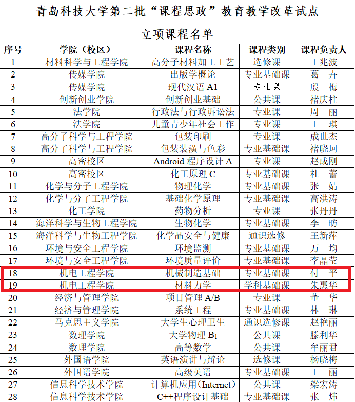 近日,在学校公布的best365体育官网平台第二批“课程思政”教育教学改革试点立项课程的通知中,我院付平老师的《机械制造基础》与朱惠华老师的《材料力学》两门课程荣获立项。