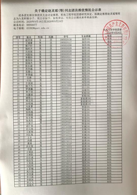 为深入贯彻《共青团推优入党工作实施办法(试行)》、《关于推动团员成为注册志愿者的意见》和《关于举办2020年秋季入党积极分子培训班的通知》精神,9月14日-25日,机电学院各团支部扎实开展推荐优秀团员做党的发展对象工作。