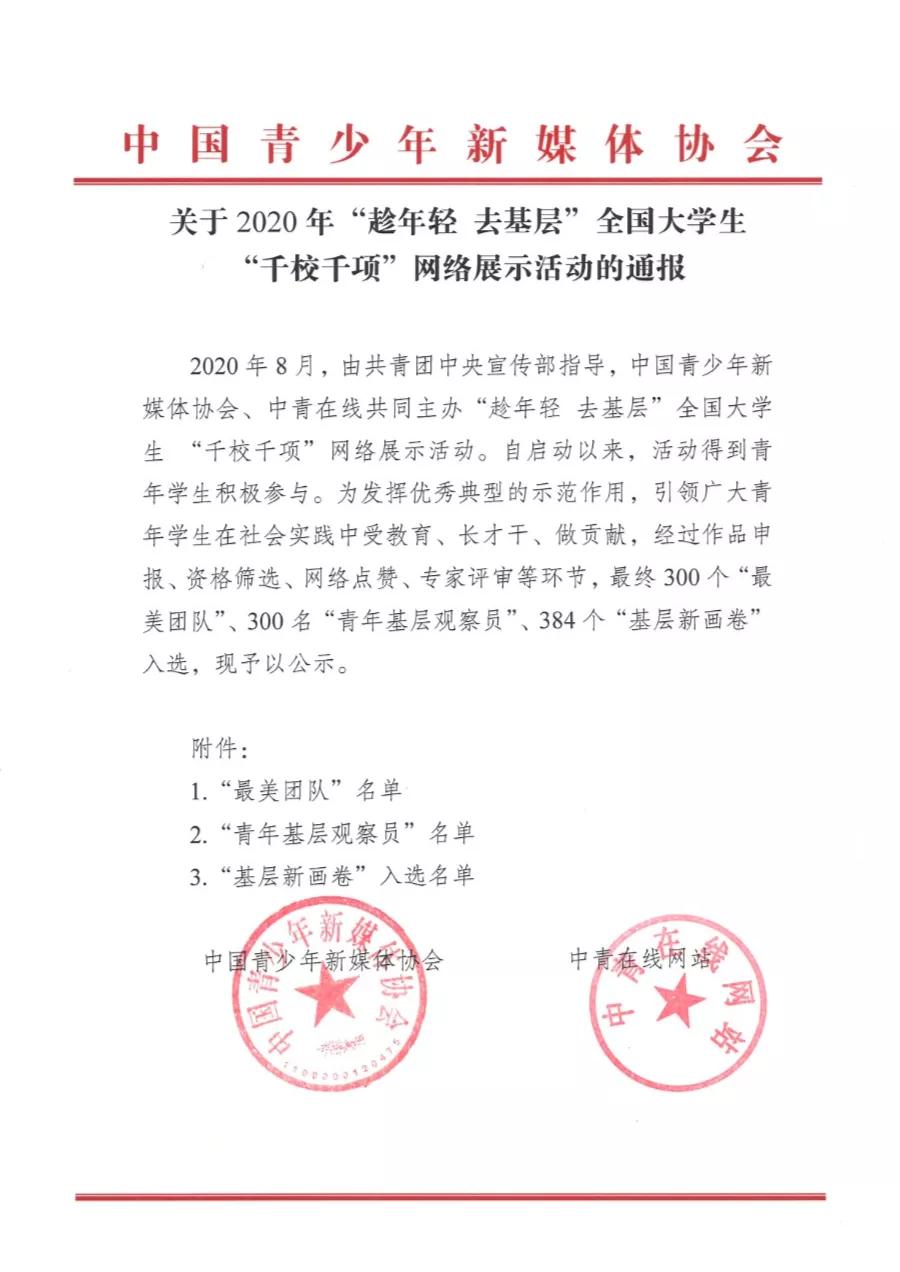 近日,由共青团中央宣传部指导,中国青少年新媒体协会、中青在线共同主办的“趁年轻 去基层”全国大学生“千校千项”网络展示活动顺利举行。自启动以来活动得到青年学生的积极参与,经过作品申报、资格筛查、网络点赞、专家评审等环节,最终在《关于2020年“趁年轻 去基层”全国大学生“千校千项”网络展示活动的通报》中,我院耿宇轩同学带领的best365体育官网平台“百尺竿头更进一步·礼赞党建百年征程”红色文化调研团获评此次活动“最美团队”荣誉称号。