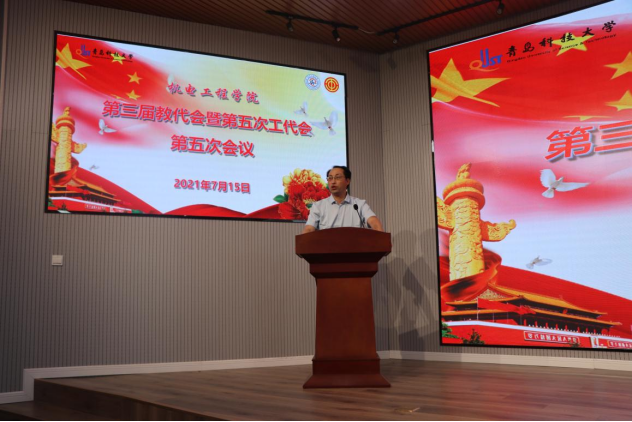 2021年7月15日14时,机电学院第三届教代会暨第五次工代会第五次会议在D3楼530会议室举行。学院党委书记孙立军,学院院长何燕、学院党政领导班子成员、教师代表及工会会员代表出席了大会,大会由学院党委书记孙立军记主持。