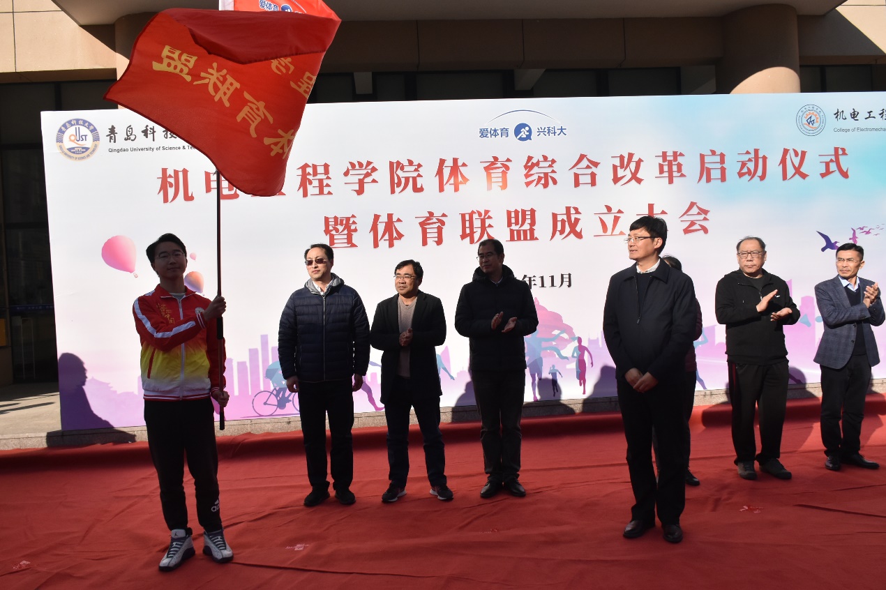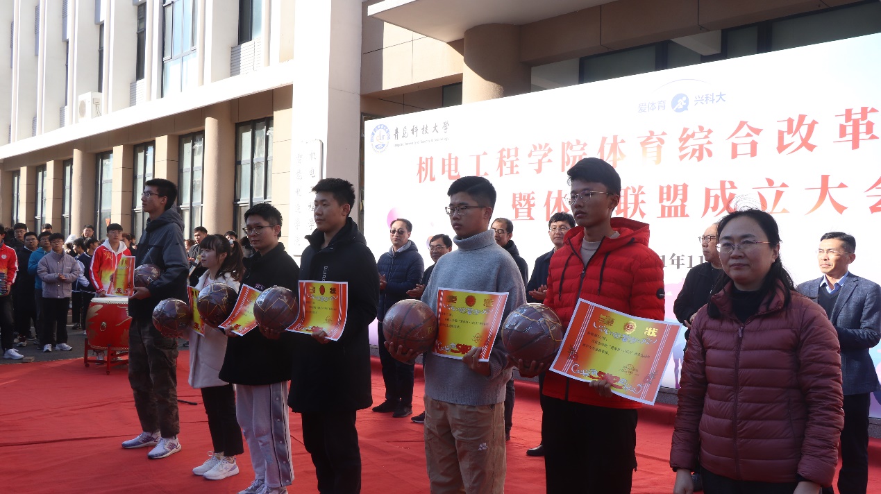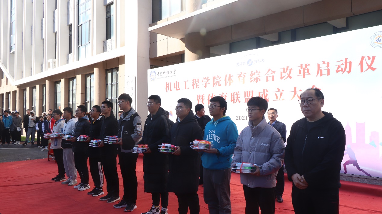 best365体育官网平台党委书记孙立军为“爱体育”APP人均里程数前20名同学颁奖,best365体育官网平台院长何燕为“爱体育”APP人均里程数前6名班集体颁奖,校团委书记毛常明宣读《关于best365体育官网平台团委成立机电学院大学生体育联盟的批复》并为机电学院大学生体育联盟授旗、学生处副处长曹永俊为学院体育联盟各协会代表授旗、机电学院大学生体育联盟学生代表李想宣读倡议书。