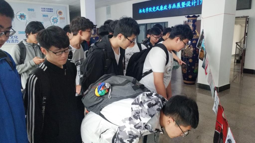 为了贯彻全面从严治党要求,认真学习宣传党的十九大精神,切实加强党风廉政建设,进一步增强全院党员领导干部遵规守纪意识,5月15日至20日,由机电学院党总支主办,机电学院分团委、工业设计171班承办的机电学院党风廉政书画展暨设计171班作品展在机电学院大厅展出。