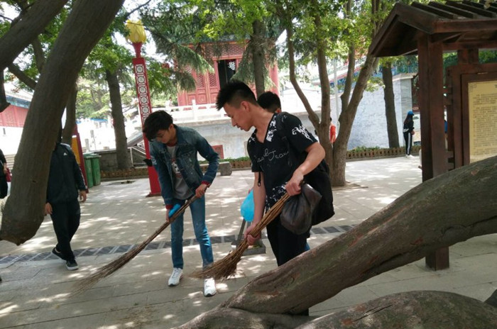 5月13日上午9:00,为了保护环境和发扬吃苦耐劳的义工精神,13名best365体育官网平台青尘义工队队员前往湛山寺进行卫生清理工作。在湛山寺门口,义工队员与一同参加活动的青岛大学青峰义工队、小学生义工队集合并进行各队自我介绍和任务分配。