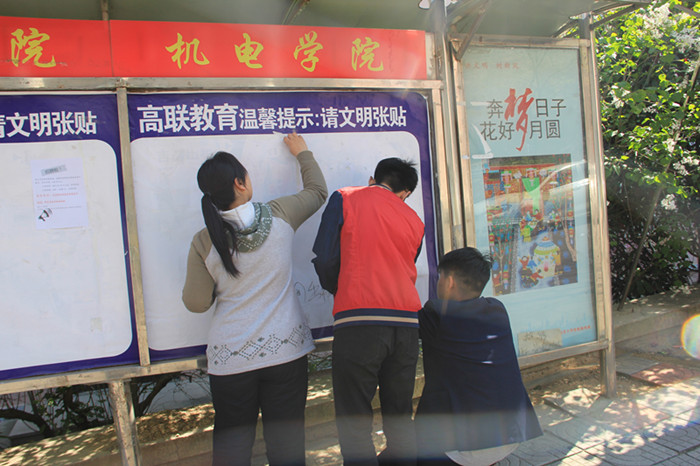 普通小广告具有密、碎、陈旧和粘贴牢固等特点,对此,志愿者们主要采取用刀具铲,用钢刷子刷,用手撕及用砂纸磨等方式进行清理,活动过程中同学们不怕脏,不畏难。刀具铲不尽用刷子刷,刷子刷不尽用砂纸磨,砂纸磨不尽用手耐心的层层揭下。活动结束后,同学们的衣服上沾满了纸屑与灰尘,甚至有些同学的手已经微微泛红。但是整个过程中同学们非但没有抱怨,反而热情十足的投入其中。机电学院的宣传栏也以更加整洁明亮的形象展现给广大的师生学子。宣传栏不仅仅是各学院的门面,更映射出了各学院学子丰富多彩的校园生活。