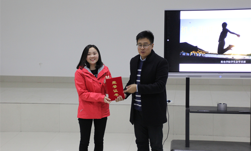 活动伊始,由主持人概括介绍了曹阳大学时期取得的成绩和经历,曹阳在大学期间一直担任能源143班的副班长,参加过多次科技创新大赛,有着丰富的学生会工作经历,还曾任院艺术团团长,连续五次拿到一等奖学金,并已保研至山东大学。随后,由李浩老师为曹阳同学颁发了优秀党员荣誉证书,并表达了对曹阳同学的高度赞扬以及对大一新生的殷切期望。对于此次演讲,曹阳别出心裁选择了“寻找真实的你”作为演讲的主题,她以张爱玲的经典语录作为切入点,从学习、工作、社会实践以及生活四个方面展开了对大学生活的讨论,并表达了对2017级新生的美好祝福。最后,由机电学院李浩老师进行了总结性发言,针对即将到来的期末考试向在场的同学们提出了要求,希望同学们能够做到德智体美劳全面发展,至此本次活动圆满结束。