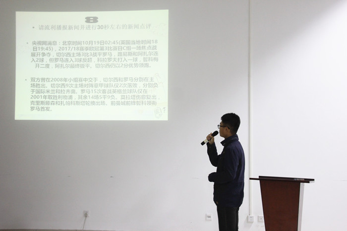 本次比赛包括自我介绍及才艺展示、现场选答和评委点评三个环节。在主持人刘宝忠精彩的开场白下,比赛正式拉开序幕,选手们闪亮登场,他们用自己独特的方式进行自我介绍,各个多才多艺,发挥特长向评委们展现自信的自己。接着,由选手在非凡逻辑、口才考验、情景设置和即兴播报四个类型中根据特长及意愿自行选择并应答,选手们灵活多变,良好的语言表达基础和临场应变能力充分展示出了他们扎实的主持功底。最后,由广播站优秀播音员田依林对选手的表现做了综合评价,充分肯定了部分选手良好的语言表达能力和临场应变能力,表达了对选手们决赛表现的期待并对此次活动的主办方表示了感谢。至此,机电学院第四届主持人大赛初赛在观众们热烈的掌声中圆满落下帷幕。