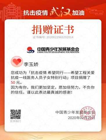 5、(捐款)陈行雨、李玉娇、宋文阳、蔡玮等同学通过各种慈善组织进行捐款志愿抗疫一线,贡献自己的一份力量。