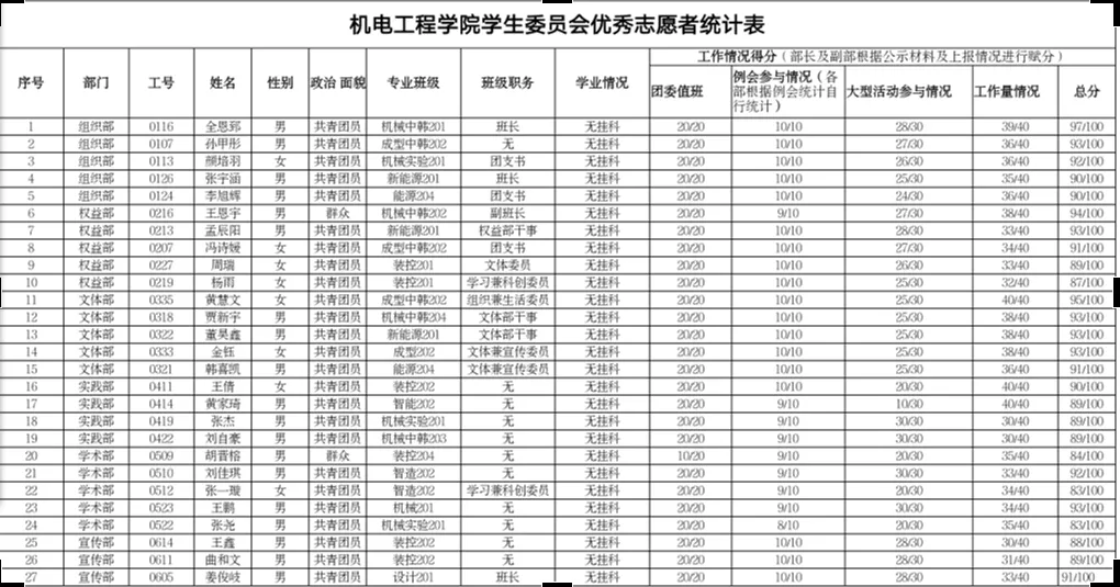 会议首先对上学期表现优异,工作突出的大一常驻志愿者进行表彰。根据团委值班情况、例会参与情况、大型活动参与情况以及每周工作量情况等指标,结合期末成绩要求,经自行申报,副部长打分,部长主席团审核及公示,最终评选出27名优秀志愿者(名单如下)。
