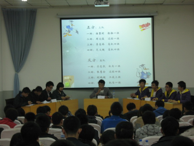 11月27日晚19:00,由机电学院学生会主办,工业设计113班承办的机电学院2011级年级辩论赛决赛在高密校区通德会堂202举行。