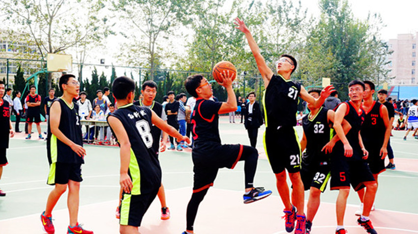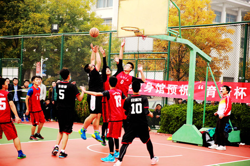 11月19日上午10:30,“育新杯”篮球赛冠军争夺战在南苑篮球场拉开序幕,机电学院对战中德学院。